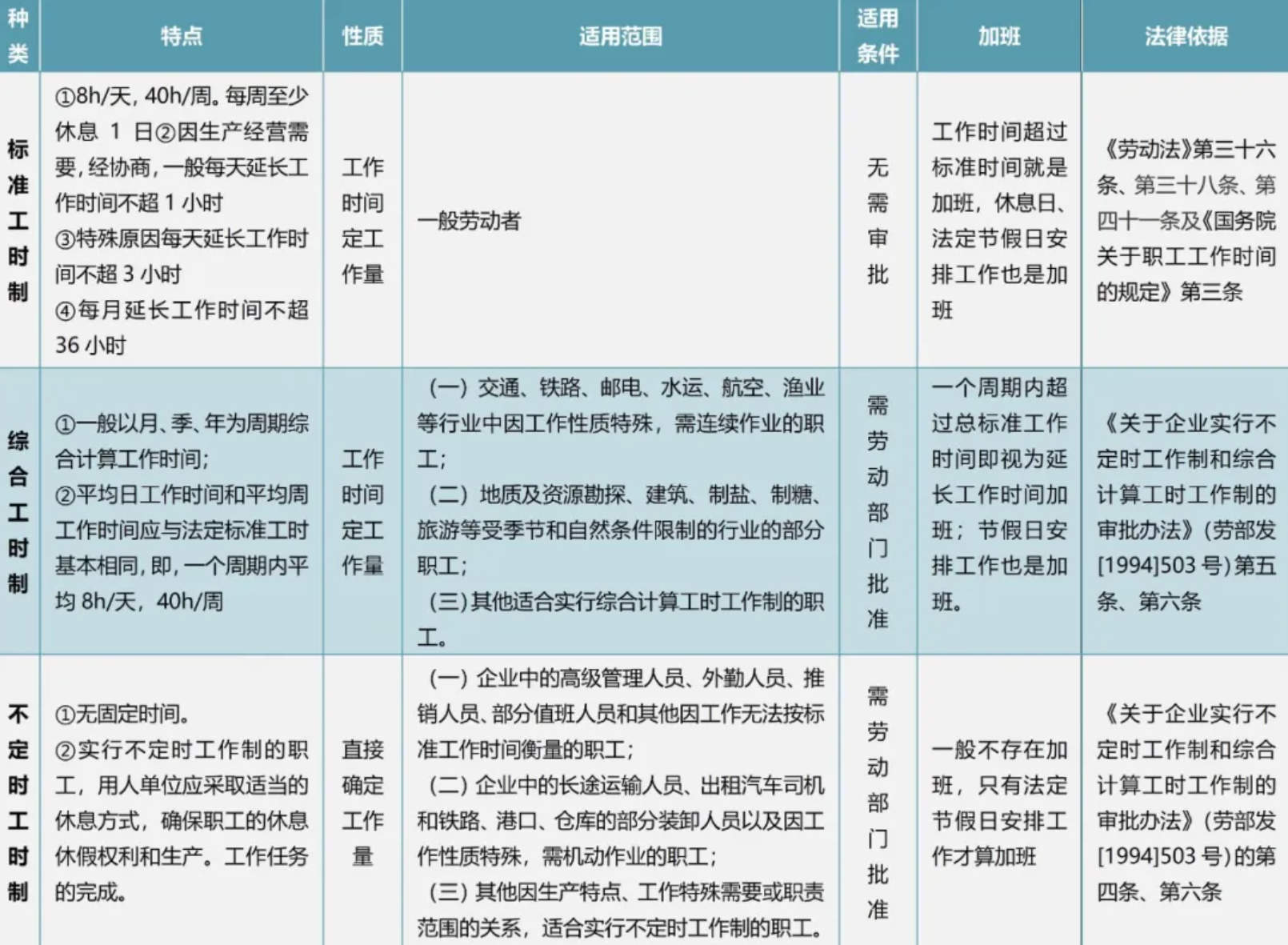 我国的工时制度总共有三种:标准工时制、综合工时制及不定时工时制,标准工时制是运用最广泛的一种。这三种工时制区别见下表: