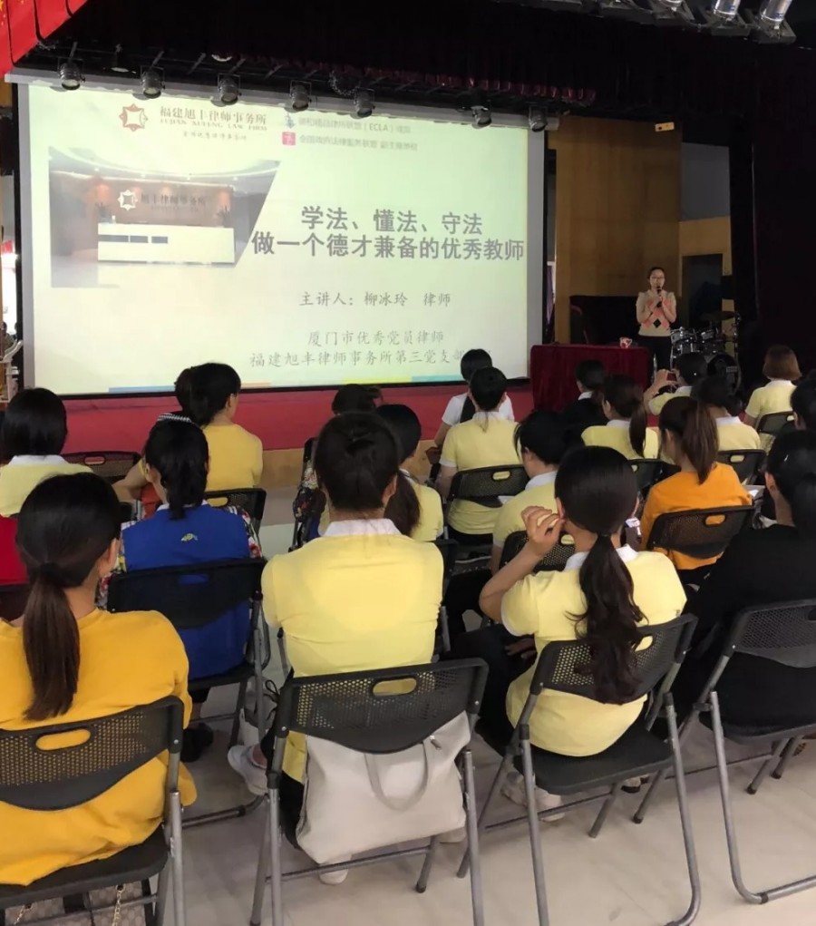 为提高学校管理人员的风险预防、风险控制意识,旭丰党员律师柳冰玲为厦门市湖里区、海沧区三百多所民办中小学、幼儿园的举办者、校长、园长开办“以案释法、依法从教”、“校园安全事故防范”等专题讲座,通过司法裁判大数据、厦门市发生的学校安全事故等实务角度切入,以案例结合法律规定,具体指导学校管理人员依法治校、依法治园。