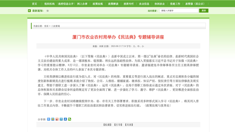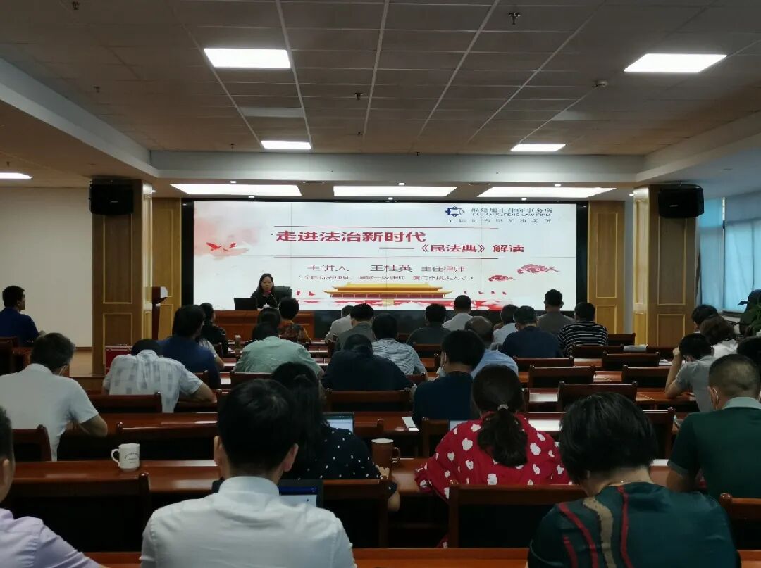 8月12日,王桂英律师为厦门市农业农村局开展题为“学习《民法典》 推进依法行政”的专题讲座。王律师除了对总则和各分编的制度创新和新规亮点进行梳理,重点结合农村农业局的法定职权,有针对性地讲解了绿色原则、土地承包经营权及其概念辨析与基本制度构架等等。全局干部职工纷纷表示通过本次讲座,对于《民法典》的总体框架和关系群众切身利益的规定有了更加全面的了解。