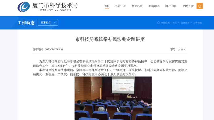 8月13日,王桂英律师就新出台的《民法典》为厦门市科学技术局开展题为“《民法典》与依法行政”的专题讲座。王律师强调了《民法典》既为政府机关对民事权利的保护和确认提供了法律依据,也为民事主体从事民事活动设定了行政法义务,是一部基础性、综合性法律。同时,针对厦门市科技局的行政职权,王律师重点讲述了《民法典》关于人格权的新规、知识产权保护的制度架构等内容。通过授课,与会人员对《民法典》各章节与行政职权有关的内容有了系统全面的了解,普遍反映受益匪浅。