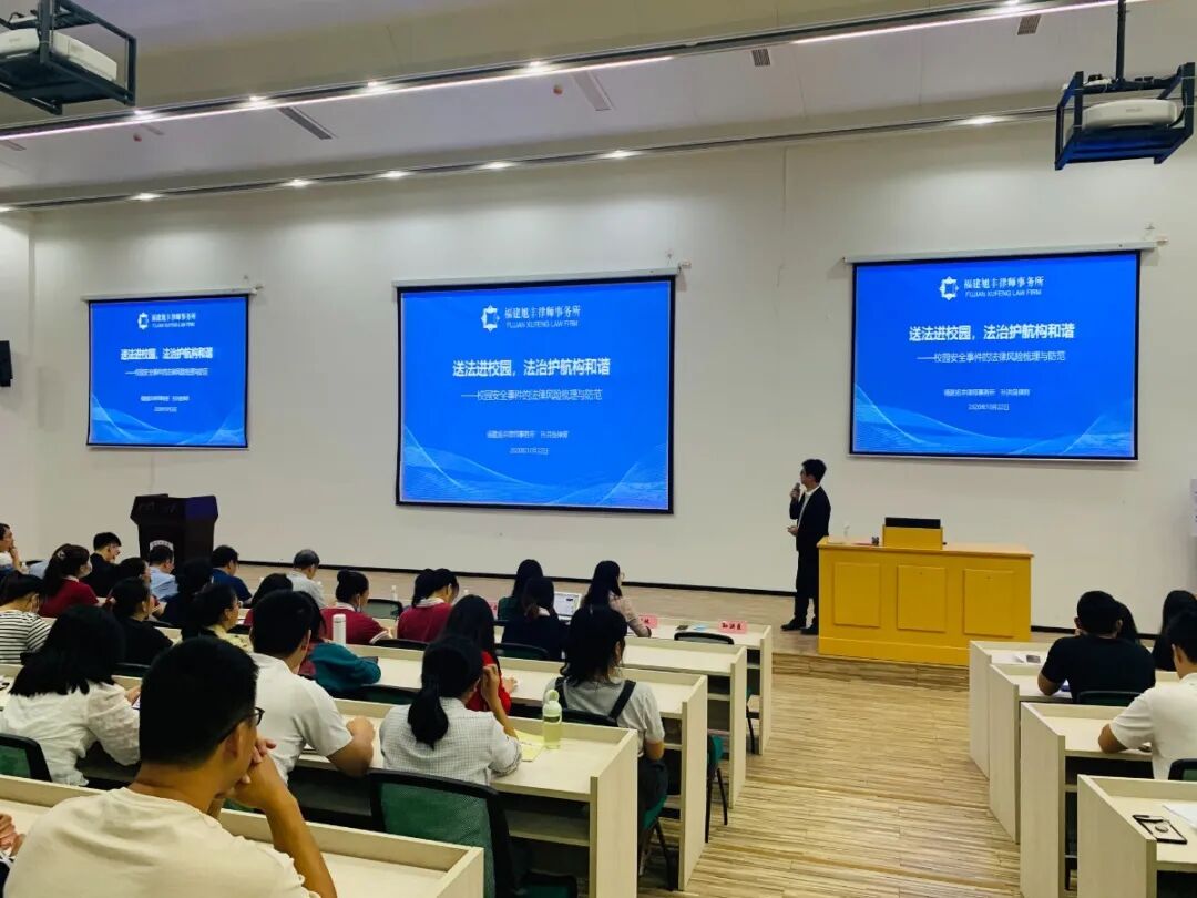 为增强教师们的法律意识,促进全校教师懂法、守法,进一步完善校园安全法制建设工作。2020年10月22日下午,我所高级合伙人孙洪良律师、刁玫律师受厦门工学院附属学校邀请到校为学校全体教职工开展《送法进校园,法治护航构和谐——校园安全事件的法律风险梳理与防范》讲座。厦门工学院附属学校校领导、全体教职工积极参加本次讲座。