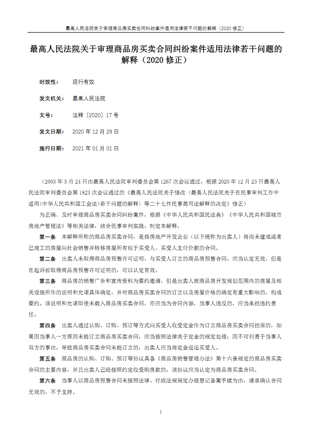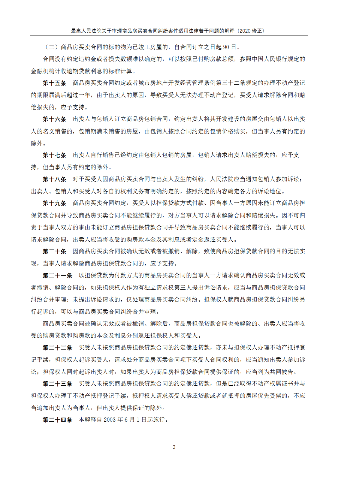为切实实施民法典,保证国家法律统一正确适用,最高人民法院审判委员会于2020年12月23日第1823次会议通过的《最高人民法院关于修改〈最高人民法院关于在民事审判工作中适用<中华人民共和国工会法>若干问题的解释〉等二十七件民事类司法解释的决定》修正)。其中,就包含此份于2021年1月1日起正式施行的《最高人民法院关于审理商品房买卖合同纠纷案件适用法律若干问题的解释(2020修正)》(以下简称(2021)版《商品房买卖合同司法解释》),全文共计24条,对《最高人民法院关于审理商品房买卖合同纠纷案件适用法律若干问题的解释》(以下简称(2003)版《商品房买卖合同司法解释》)的修订如下: