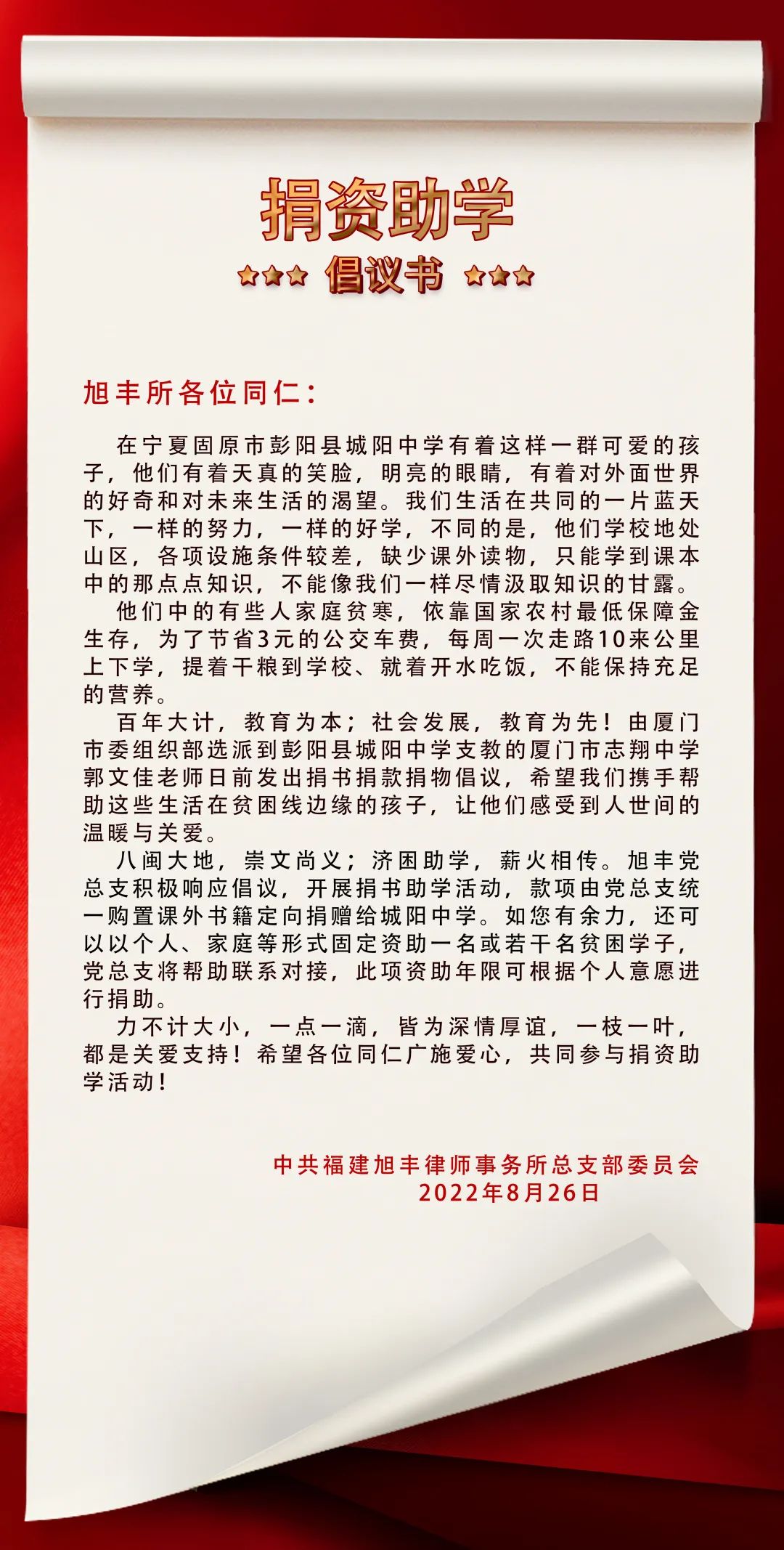 为传递爱和知识,弘扬服务人民、奉献社会的志愿精神,中共福建旭丰律师事务所总支部委员会于2022年8月底在律所内部发起了爱心捐书活动。