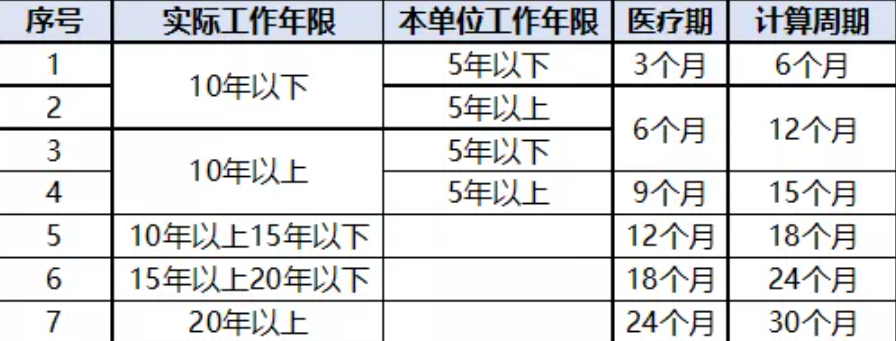 02 医疗期的计算标准。 医疗期与劳动者的工作年限相挂钩,根据劳动部发布并于1995年1月1日实施的《企业职工患病或非因工负伤医疗期的规定》第三条、第四条的规定,为方便记忆以表格方式整理如下:
